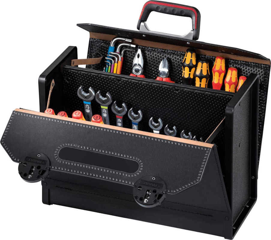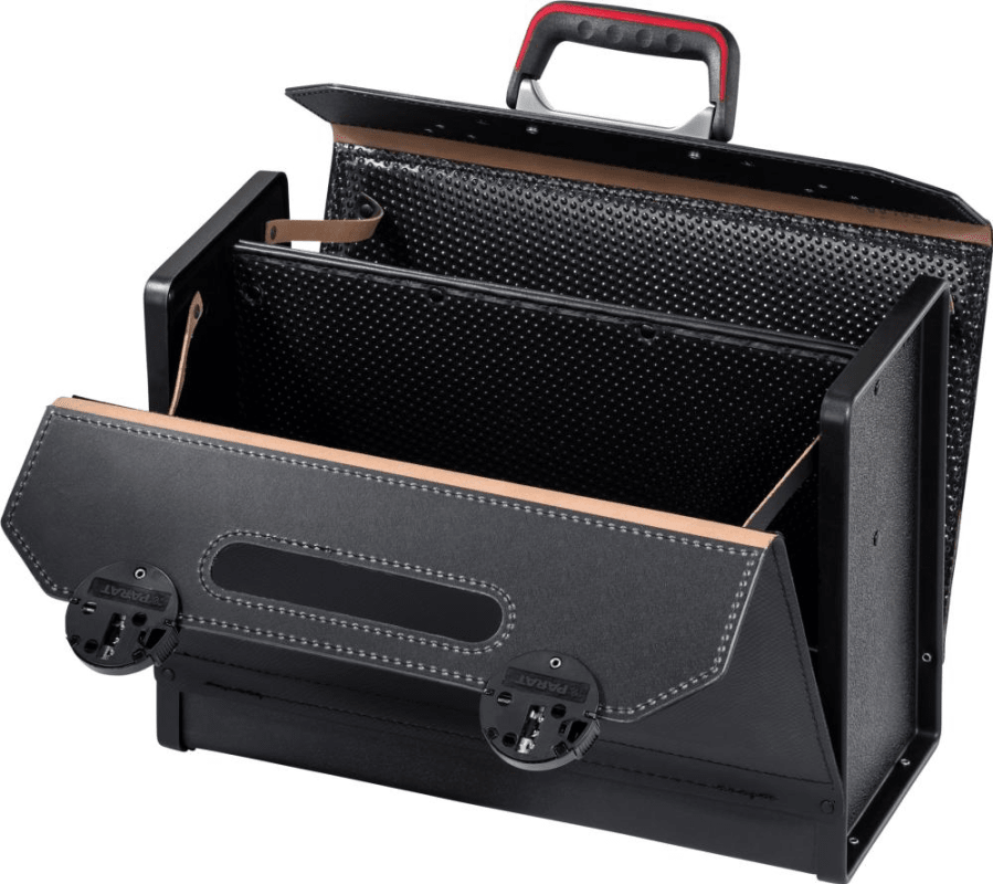 Werkzeugtasche TOP-LINE• Bodenschale und Seitenteile aus verschleißfestem, feuchtigkeitsresistentem ABS-Kunststoff, • Klappe aus kräftigem, geprägtem Rindleder, schwarz, mit strapazierfähigen Wänden