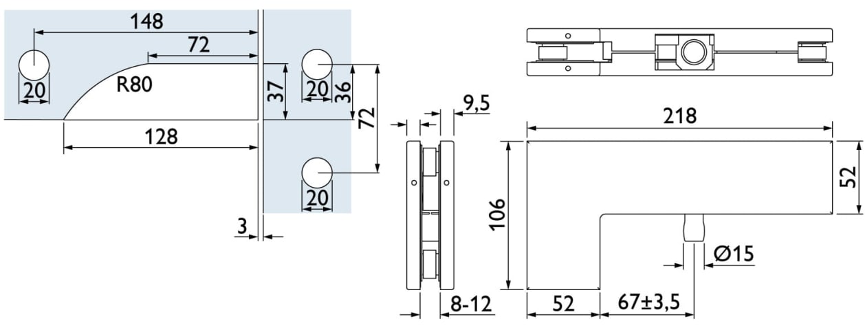 Patch Fitting obere Winkelführung 218 x 106 mm, mit Führungsbolzen 15 mm, für Glasstärke 8 - 12 mm, Oberfl. 60 (Edelstahl matt)