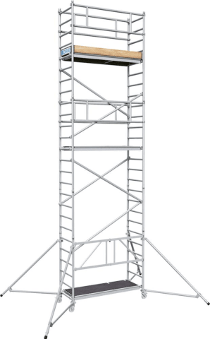 Gerüst PaxTower 1T • Gerüstteile: Aluminium • Einfache Einhandbedienung des Klapprahmens mit robustem Arretierknopf: Feststellen und lösen mit nur einem Klick • Leichtlauf Aufsteckführung aus Hartkunststoff: kein Verkanten beim Zusammenführen der Aufsteckrahmen • Patentierte Bordbrett-Einheit: Schnell platziert, schnell fixiert • Holm- und Sprossendurchmesser: 45 mm • Lenkrollen: Ø 125 mm mit Feststellbremse (durch Rollenadapter zu spindelbaren Rollen aufrüstbar) • Nach EN 1004-1 (Ausnahme Zarges-Nr. 53511), Gerüstklasse 3 (belastbar bis 200 kg/m²) • EN 1004:2020
