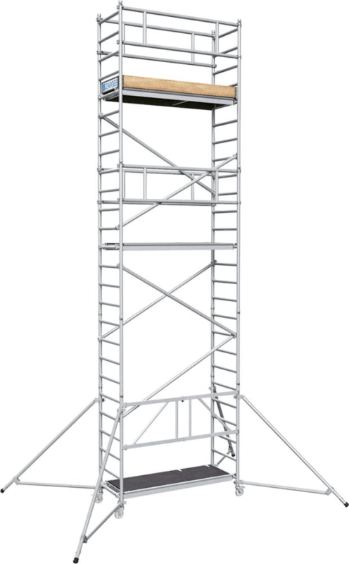 ZARGES PaxTower 1T: -Einfache Einhandbedienung des Klapprahmens mit robustem Arretierknopf: Feststellen und lösen mit nur einem Klick. -Leichtlauf-Aufsteckführung aus Hartkunststoff: Kein Verkanten beim Zusammenführen der Aufsteckrahmen. -Patentierte Bordbrett-Einheit: Schnell platziert, schnell fixiert. -Gerüstlänge: 1,80 m; Gerüstbreite: 0,72 m. -Nach neuer EN 1004; Gerüstklasse 3 (belastbar bis 200kg/m²). -125 mm Lenkrollen mit Feststellbremse; diese sind durch Rollenadapter (Bestell-Nr. 42794) zu spindelbaren Rollen aufrüstbar. -Holm- und Sprossendurchmesser 45 mm.