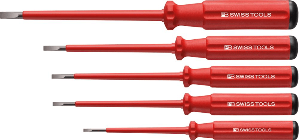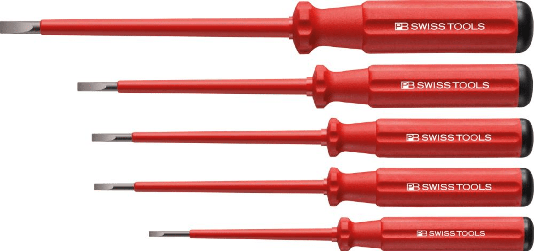 VDE-Schraubendreher-Satz für Schlitz-Schrauben, Nr. PB 5538• Hochlegierter Federstahl • Runde Klinge • 2-Komponenten-Griff SwissGrip mit Abrollschutz • Beständig gegenüber Lösungsmitteln, Ölen, Säu