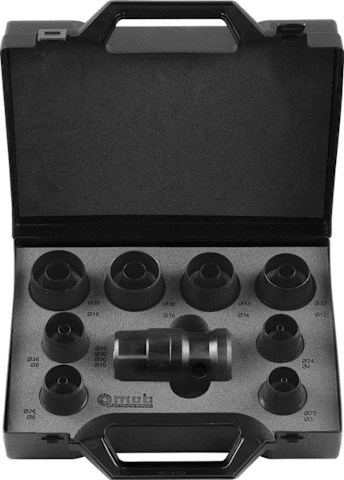 Locheisensätze in bester Industriequalität. Aus hochfestem Spezialstahl, geschliffene, fein polierte Pfeifen. Zum Schneiden von Weichmaterialien (Gummi, Leder, Filz, Schaumstoff...). Armierte Werkstoffe (Blech, Glasfaser) bis 0,3 mm können ebenso gestanzt werden. In stabiler Metallkassette. Locheisen von 3 bis 40 mm: Gewindeeinsätze 3; 4; 6; 8; 10 mm, Aufsteckeinsätze 12; 14; 16; 18; 20; 22; 24; 26; 28; 30; 32; 34; 36; 38; 40 mm, Blockhalter.