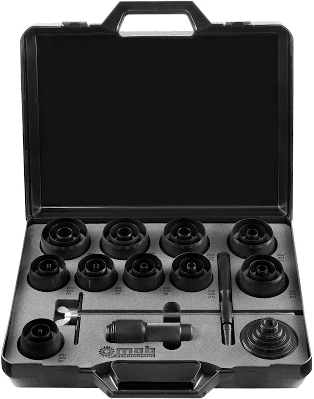 Locheisensätze in bester Industriequalität. Aus hochfestem Spezialstahl, geschliffene, fein polierte Pfeifen. Zum Schneiden von Weichmaterialien (Gummi, Leder, Filz, Schaumstoff...). Armierte Werkstoffe (Blech, Glasfaser) bis 0,3 mm können ebenso gestanzt werden. In stabiler Metallkassette. Locheisen von 3 bis 60 mm, Gewindeeinsätze 3; 4; 6; 8; 10 mm, Aufsteckeinsätze 12; 14; 16; 18; 20; 22; 24; 26; 28; 30; 32; 34; 36; 38; 40; 42; 44; 46; 48; 50; 52; 54; 56; 58; 60 mm, Blockhalter 11 bis 60 mm, Halter 3 bis 30 mm.