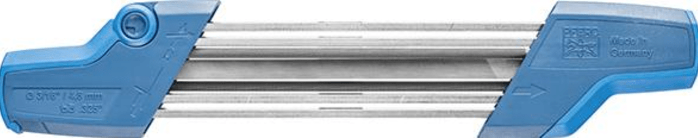 Lieferung: In Kunststofftasche, inklusive Schärfgerät, 2 Kettensägefeilen und Tiefenbegrenzerfeile.