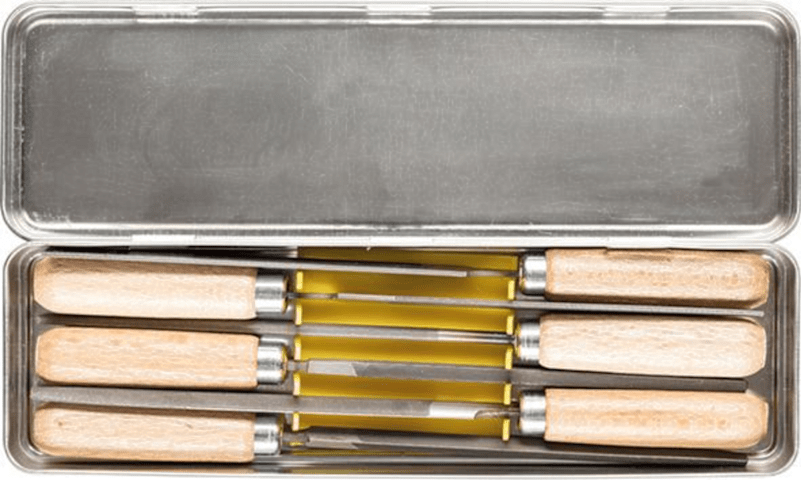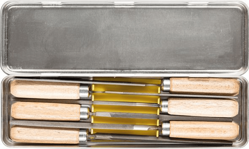 Schlüsselfeilen-Satz, im Blechkasten, Pferd6-teilig, bestehend aus: je 1 Schlüsselfeile flachstumpf, flachspitz, dreikant, vierkant, rund, halbrund. Mit Holzheft im Blechkasten.