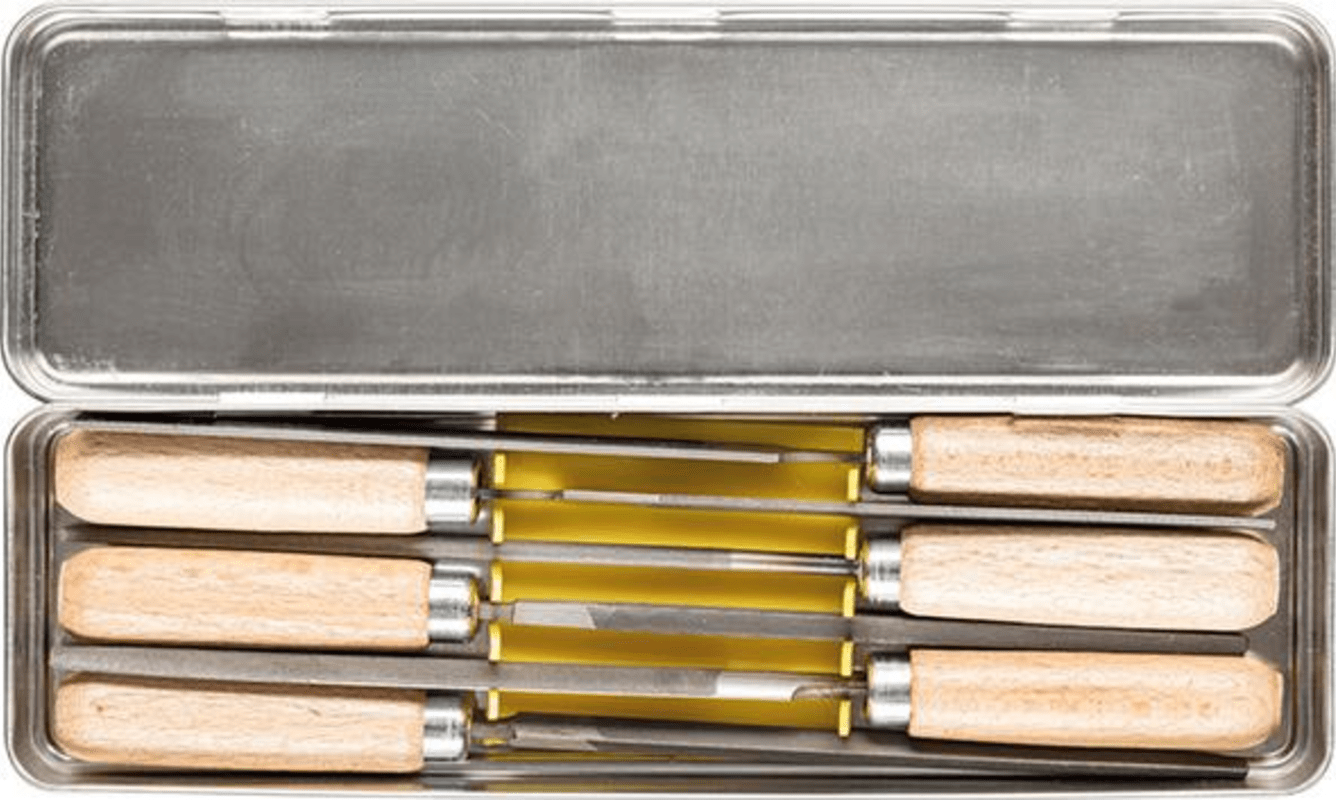 Inhalt: 6 Schlüsselfeilen flachstumpf, flachspitz, 3-kant, 4-kant, rund, halbrund.