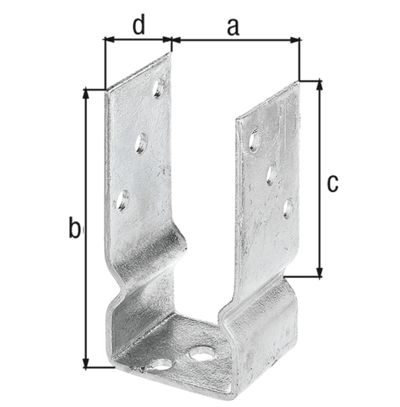 GAH Alberts Pfostenträger; Basis: Pfostenträger; Form: U-Form; Ausführung: mit seitlicher Pfostenauflage; Werkstoff: Stahl; Oberfläche: feuerverzinkt; Anwendbare Materialien: Holz; Anwendungsbereich: