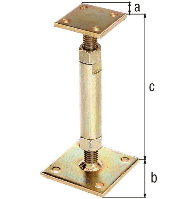 GAH Alberts; Typbezeichnung: Pfostenträger; Ausführung: höhenverstellbar; Werkstoff: Stahl; Oberfläche: galvanisch gelb verzinkt; Befestigungsart der Grundplatte: zum Aufschrauben; Befestigung: Schrau