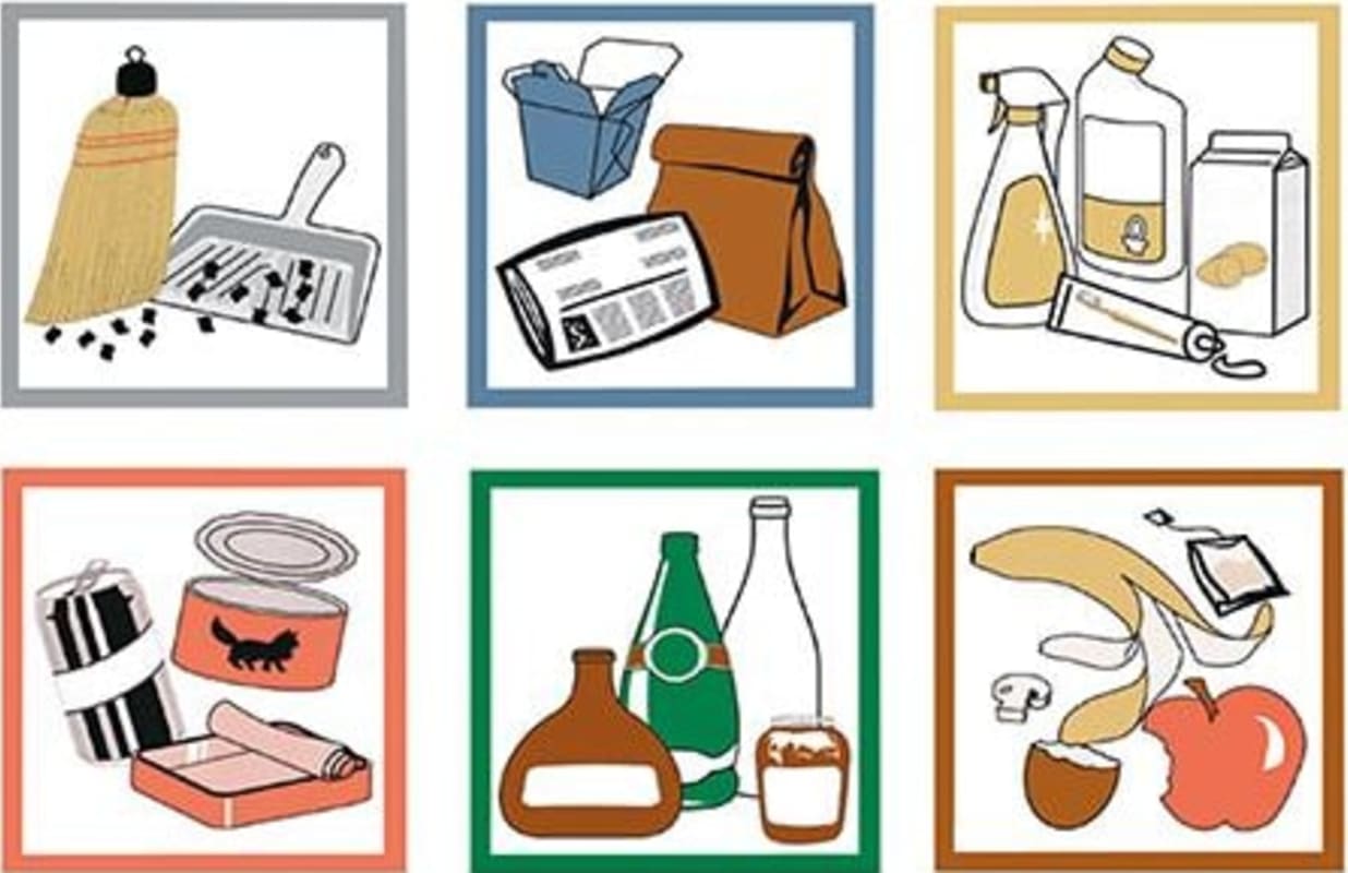 Piktogramm-Set, 6-teilig • Material: selbstklebende Symbolaufkleber, farbig • Symbolik: „Papier“, „Metall“, „Bioabfall“, „Restmüll“, „Kunststoff“ und „Glas“ • Zur Behälterkennzeichnung