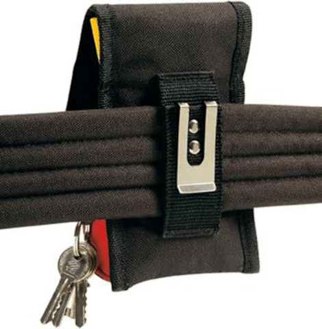 • Mit breitem Klettverschluss, Gürtelschlaufe und -clip