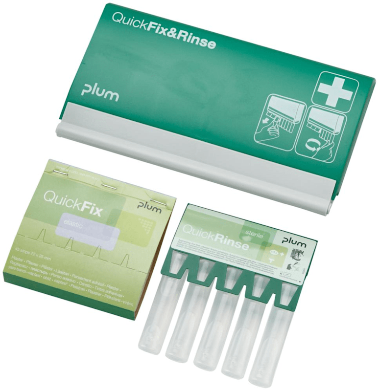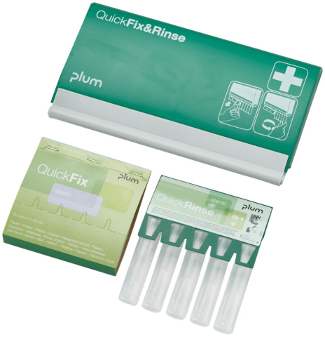 Erste-Hilfe-Set »QuickFix & Rinse«Eigenschaften: • Wandstation für individuelle Kombinationen aus Pflastern und Augenspülampullen • 5 Augenspülampullen mit 0,9 % steriler Natriumchloridlösung • Sc