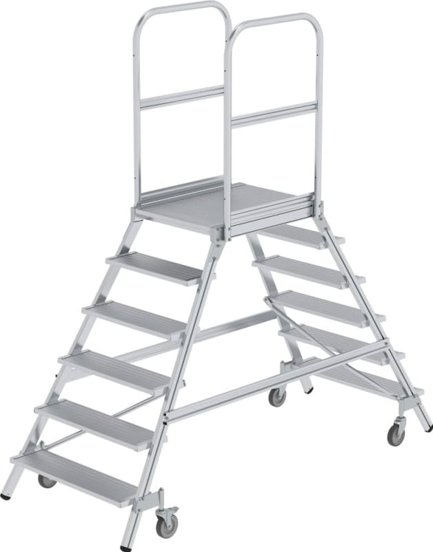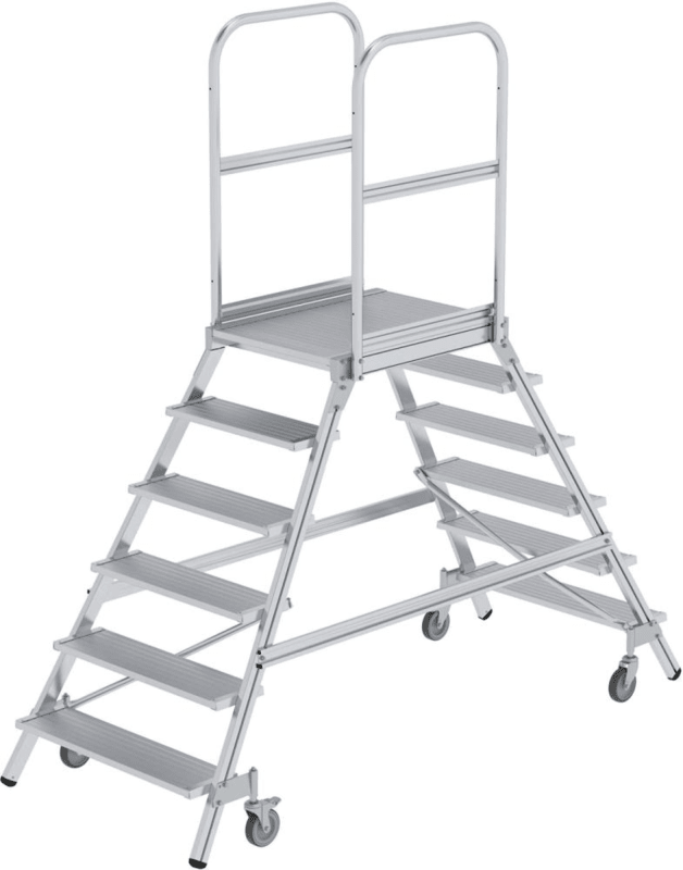 Podesttreppe, zweiseitig begehbar, Alu, geriffelt • Material: Aluminium • Rechteckrohrholm-Konstruktion • Stufen- und Plattform-Ausführung: Alu-geriffelt • Standplattform: ca. 600 x 800 mm, komplett mit beidseitigem Geländer, Fuß- und Knieleiste (Höhe 1000 mm) • Stufen: 200 mm tief • Beräderung: mit Federrollen, 4 selbstarretierende Lenkrollen, Ø 125 mm, davon 2 mit Feststeller • Belastung: max. 150 kg Lieferung: Erfolgt in Bauteilen, Anleitung liegt bei. Sicherheitshinweis: Handläufe sind gemäß DIN EN 131-7 an Aufstiegen von Podesttreppen bei einem Steigwinkel kleiner als 60° erforderlich, bei einem Steigwinkel größer oder gleich 60° optional. Bitte Pflichtzubehör mitbestellen.