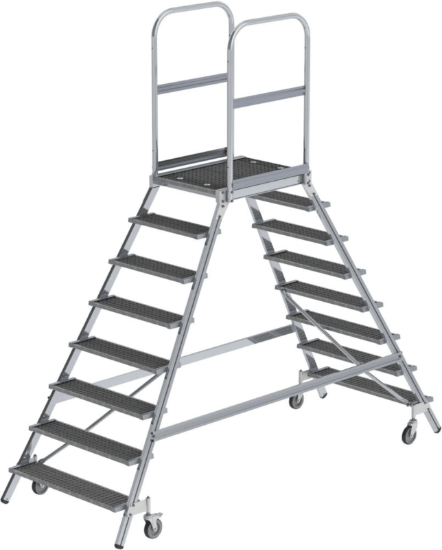 Podesttreppe, zweiseitig begehbar, Stahl-Gitterrost • Material: Aluminium • Rechteckrohrholm-Konstruktion • Stufen- und Plattform-Ausführung: Stahl-Gitterrost • Standplattform: ca. 600 x 800 mm, komplett mit beidseitigem Geländer, Fuß- und Knieleiste (Höhe 1000 mm) • Stufen: 200 mm tief • Beräderung: mit Federrollen, 4 selbstarretierende Lenkrollen, Ø 125 mm, davon 2 mit Feststeller • Belastung: max. 150 kg Lieferung: Erfolgt in Bauteilen, Anleitung liegt bei. Sicherheitshinweis: Handläufe sind gemäß DIN EN 131-7 an Aufstiegen von Podesttreppen bei einem Steigwinkel kleiner als 60° erforderlich, bei einem Steigwinkel größer oder gleich 60° optional. Bitte Pflichtzubehör mitbestellen.