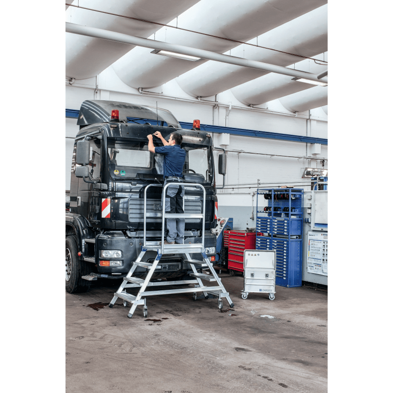 Maximale Flexibilität bei Auf- und Abstieg, größerer Arbeitsbereich auf den Stufen, und hohe Mobilität sowie sicherer Stand durch vier Federrollen.