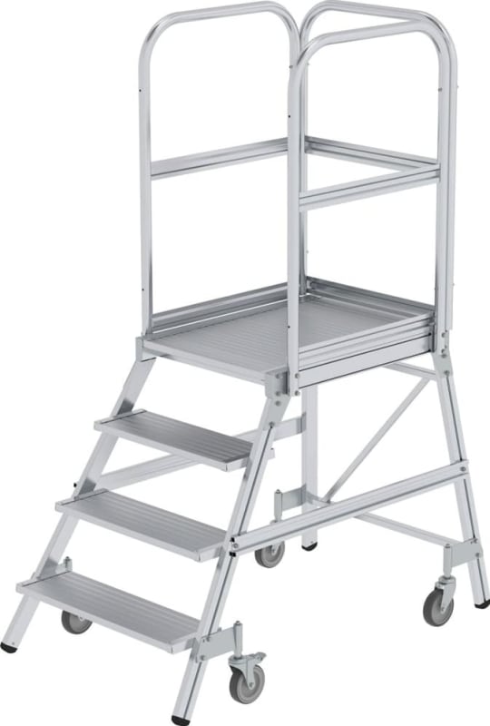 • Standplattform: ca. 600 x 800 mm, komplett mit dreiseitigem Geländer, Fuß- und Knieleiste (Höhe 1000 mm)