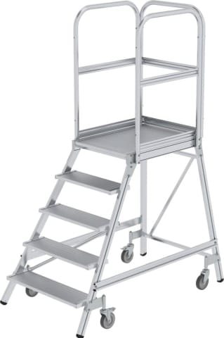 Podesttreppe, einseitig begehbar, Alu, geriffelt • Material: Aluminium • Rechteckrohrholm-Konstruktion • Stufen- und Plattform-Ausführung: Alu-geriffelt • Standplattform: ca. 600 x 800 mm, komplett mit dreiseitigem Geländer, Fuß- und Knieleiste (Höhe 1000 mm) • Stufen: 200 mm tief • Beräderung: mit Federrollen, 4 selbstarretierende Lenkrollen, Ø 125 mm, davon 2 mit Feststeller • Belastung: max. 150 kg Lieferung: Erfolgt in Bauteilen, Anleitung liegt bei. Sicherheitshinweis: Handläufe sind gemäß DIN EN 131-7 an Aufstiegen von Podesttreppen bei einem Steigwinkel kleiner als 60° erforderlich, bei einem Steigwinkel größer oder gleich 60° optional. Bitte Pflichtzubehör mitbestellen.