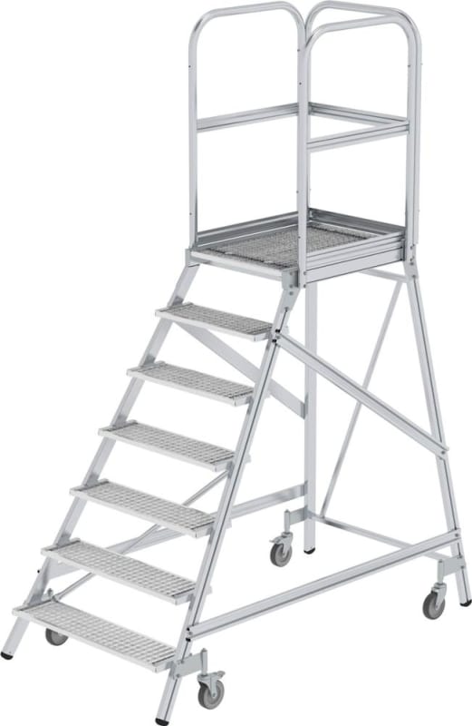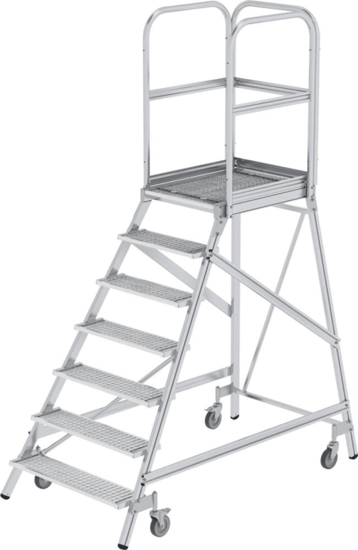 Podesttreppe, einseitig begehbar, Stahl-Gitterrost • Material: Aluminium • Rechteckrohrholm-Konstruktion • Stufen- und Plattform-Ausführung: Stahl-Gitterrost • Standplattform: ca. 600 x 800 mm, komplett mit dreiseitigem Geländer, Fuß- und Knieleiste (Höhe 1000 mm) • Stufen: 200 mm tief • Beräderung: mit Federrollen, 4 selbstarretierende Lenkrollen, Ø 125 mm, davon 2 mit Feststeller • Belastung: max. 150 kg Lieferung: Erfolgt in Bauteilen, Anleitung liegt bei. Sicherheitshinweis: Handläufe sind gemäß DIN EN 131-7 an Aufstiegen von Podesttreppen bei einem Steigwinkel kleiner als 60° erforderlich, bei einem Steigwinkel größer oder gleich 60° optional. Bitte Pflichtzubehör mitbestellen.