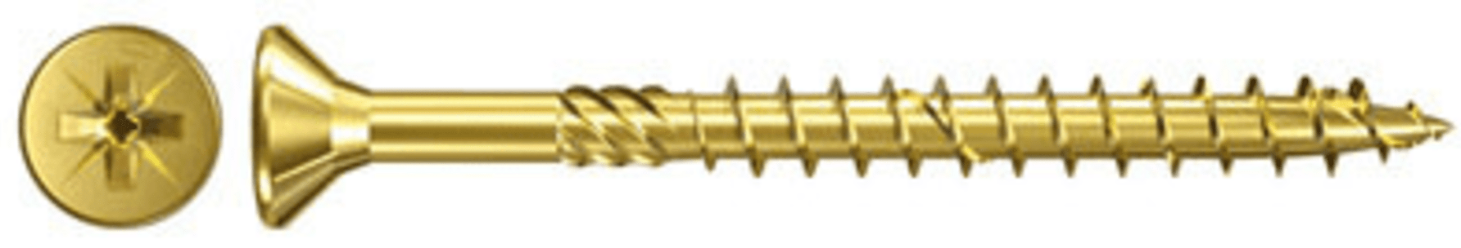 Spanplattenschraube fischer Power-Fast. Galvanisch verzinkt, gelb passiviert, Senkkopf, Kreuzschlitz Pz, Teilgewinde, Hochleistungs-Gleitbeschichtung. Schrauben ab 50 mm Länge mit Fräsrippen am Schaft