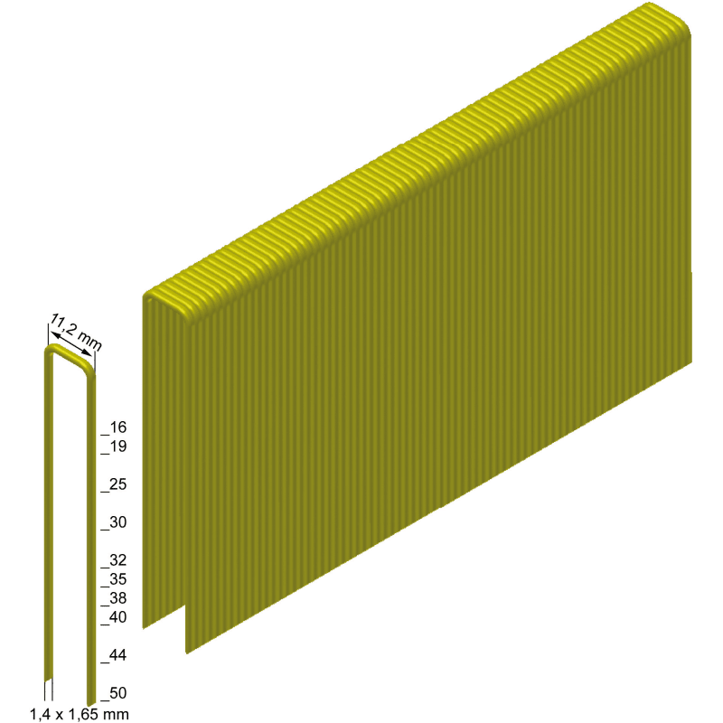 Heftklammern Typ Z, passend für Druckluftnagler 4C-Z50 Eigenschaften: • Drahtmaß: 1,4 x 1,6 mm • Rückenbreite: 11,2 mm • verzinkt, geharzt