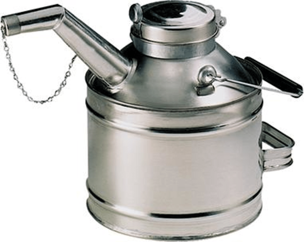 Ölvorrats-KanneAus Weißblech, mit Scharnierdeckel und unverlierbarem Rohrverschluss, kräftiger Tragbügel, doppelt gebördelter Boden und geschweißte Naht, standfeste Form.