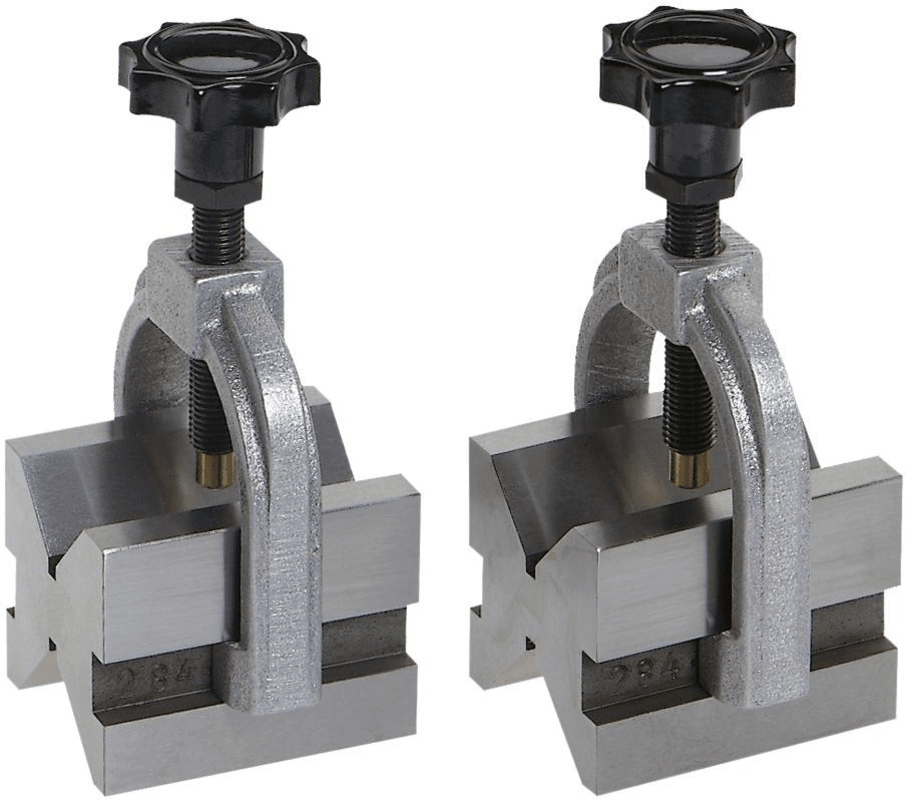 Doppelprismenpaar mit Spannbügel• Paarweise feingeschliffen • Mit 2 unterschiedlich großen 90°-Einschnitten • Stirnflächen winklig zur Standfläche geschliffen • Genauigkeit 0,004 mm