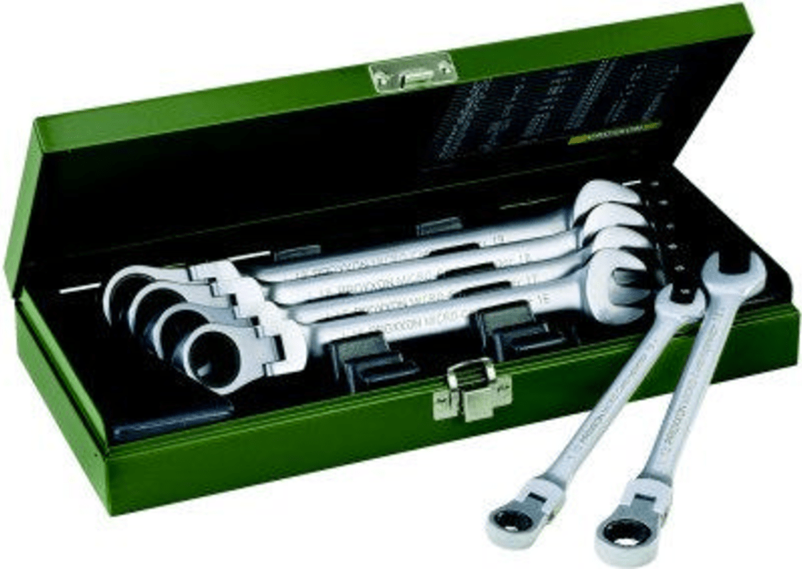 Micro-Combispeeder Ratschenschlüssel-Satz 6-tlg. mit selbsthemmendem Gelenk bis 90 Grad in Stahlbox. Inhalt je 1 Stück: 10-13-16-17-18 und 19 mm.