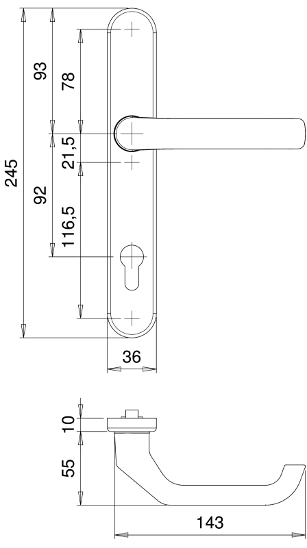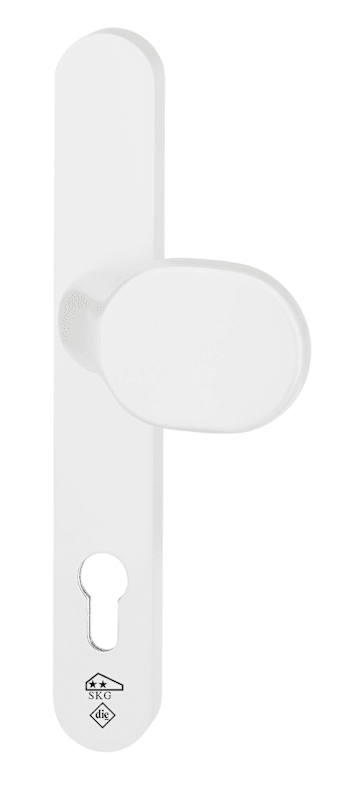 Wechselgarnitur Kronos 1207/2535, Langschild oval, Profilzylinder gelocht, Entfernung 92mm, Vierkant 8, DIN Links-Rechts, mit Stütznocken, verkehrsweiß beschichtet, festdrehbar