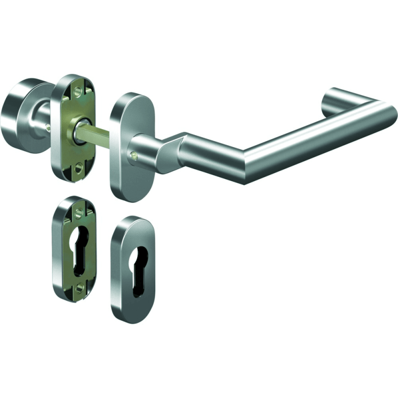 OGRO Wechselgarnitur Premium 8907A/6620; Produkttyp: Wechselgarnitur; Produkttyp (Hersteller): Wechselgarnitur; Ausführung: Rosette; Befestigungsart Drückerrosette (außen): verdeckt verschraubt; Befestigungsart Drückerrosette (innen): verdeckt verschraubt; Befestigungsart Schlüsselrosette (außen): verdeckt verschraubt; Befestigungsart Schlüsselrosette (innen): verdeckt verschraubt; Befestigungstechnik: ohne Stütznocken; Form Drückerrosette: oval; Form Schlüsselrosette (außen): oval; Form Schlüsselrosette (innen): oval; Vierkant: 8 mm; Material: Aluminium; Form Türgriff (innen): versetzt,U-Form,Gehrung; Form Türgriff (außen): rund; Ausführung Türgriff (außen): fest; Durchmesser Türgriff (innen): 20 mm; Länge Türgriff (innen): 169 mm; Höhe Türgriff (innen): 67 mm; Höhe Türgriff (außen): 42 mm; Breite Drückerrosette (außen): 31,5 mm; Breite Drückerrosette (innen): 31,5 mm; Länge Drückerrosette (außen): 68,5 mm; Länge Drückerrosette (innen): 68,5 mm; Höhe Drückerrosette (außen): 9 mm; Höhe Drückerrosette (innen): 9 mm; Breite Schlüsselrosette (außen): 31,5 mm; Breite Schlüsselrosette (innen): 31,5 mm; Länge Schlüsselrosette (außen): 68,5 mm; Länge Schlüsselrosette (innen): 68,5 mm; Höhe Schlüsselrosette (außen): 9 mm; Höhe Schlüsselrosette (innen): 9 mm; Lagerung: festdrehbar,wartungsfreies Gleitlager; Einsatzbereich: Haustür,Objekttür; Türart: Rohrrahmen; Türwerkstoff: Aluminium,Kunststoff; Anwendung: außen/innen; Lochung: Profilzylinder gelocht; DIN-Richtung: DIN Links-Rechts; Farbe: silber; Farbton: naturfarben; Oberfläche: satino; Ausführung Vierkant: Rollenwechselstift; Türstärke min.: 35 mm; Türstärke max.: 48 mm; Norm: DIN EN 1906