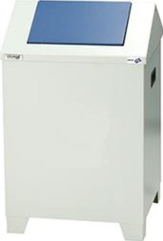 Putzwollbehälter • Material: Stahlblech, verzinkt • Oberfläche: pulverbeschichtet • Eingelassene Tragehilfen • 2 gegenüberliegende, selbstschließende Einwurfklappen