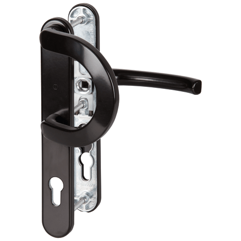 HOPPE-Aluminium-Schmalschild-Wechsel-Garnitur für Profiltüren:: • Lagerung: außen Stoßgriff fest, ummontierbar; innen Türgriff fest/drehbar, Rückholfeder, wartungsfreies Gleitlager • Verbindung: HOPP