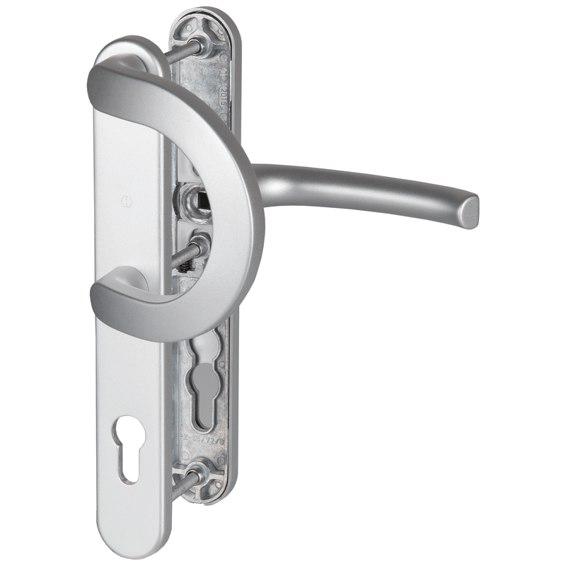 HOPPE-Aluminium-Schmalschild-Wechsel-Garnitur für Profiltüren:: • Lagerung: außen Stoßgriff fest, ummontierbar; innen Türgriff fest/drehbar, Rückholfeder, wartungsfreies Gleitlager • Verbindung: HOPP