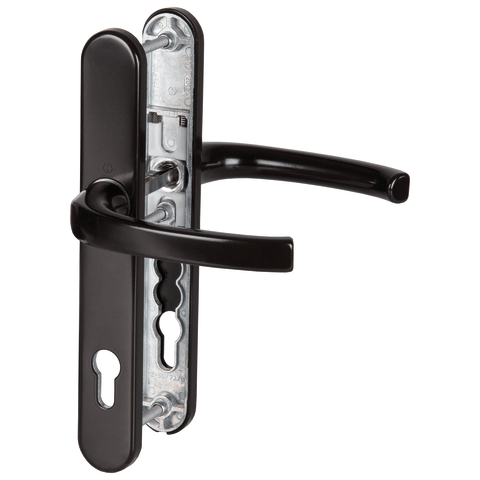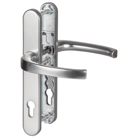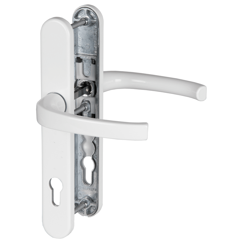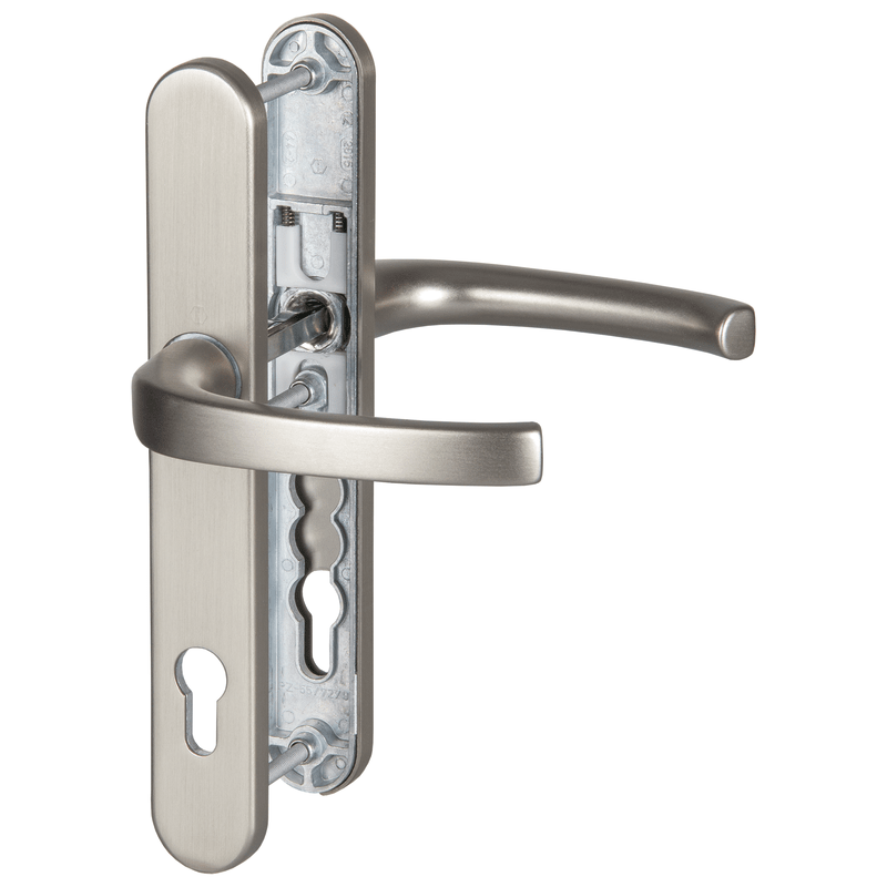 HOPPE-Aluminium-Schmalschild-Türgriff-Garnitur für Profiltüren: • Lagerung: Türgriffe fest/drehbar, Rückholfeder, wartungsfreie Gleitlager • Verbindung: HOPPE-Profilvollstift • Unterkonstruktion: Zam