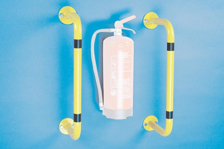 Rammschutzbügel • Bestmögliche Sicherheit für Betriebsinventar wie Lager-Regale, Maschinen, Feuerlöscher, Stromkästen etc. • Zinkgrundiert • Farbe: pulverbeschichtet, RAL 1018 zinkgelb, schwarze Warn