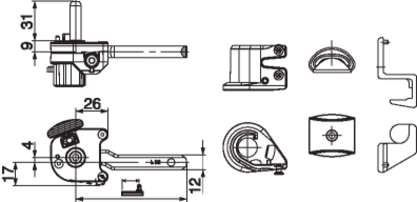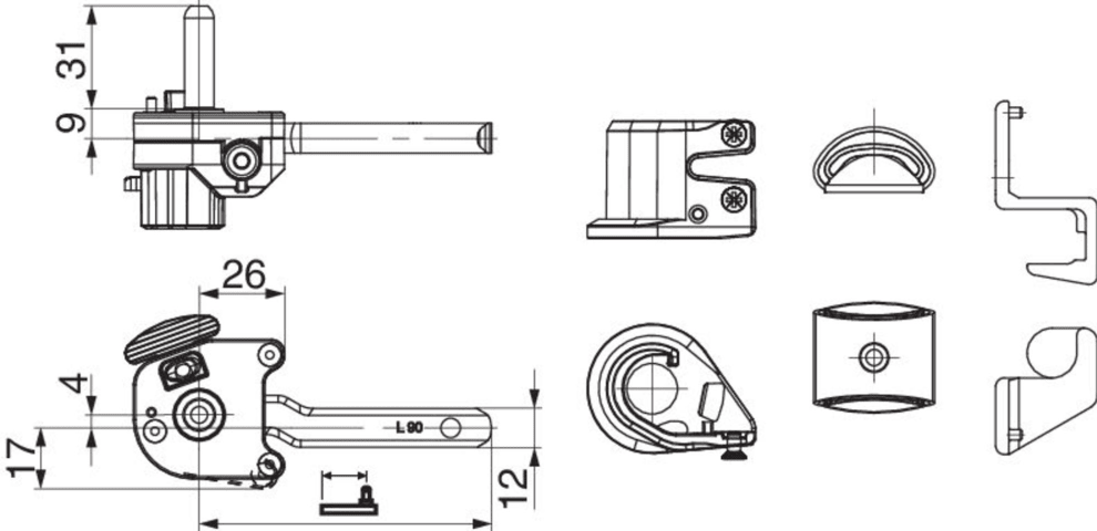 Rasthalter mit Kloben 4 mm gekröpft mit Anschlagpuffer Abst. 68-70 L90 rechts schwarz-S