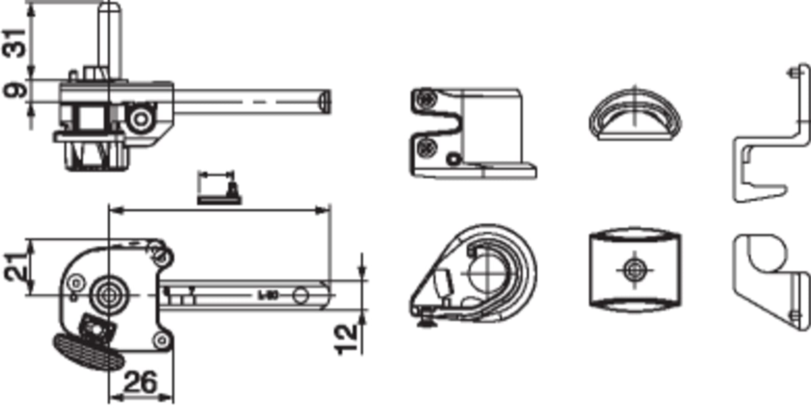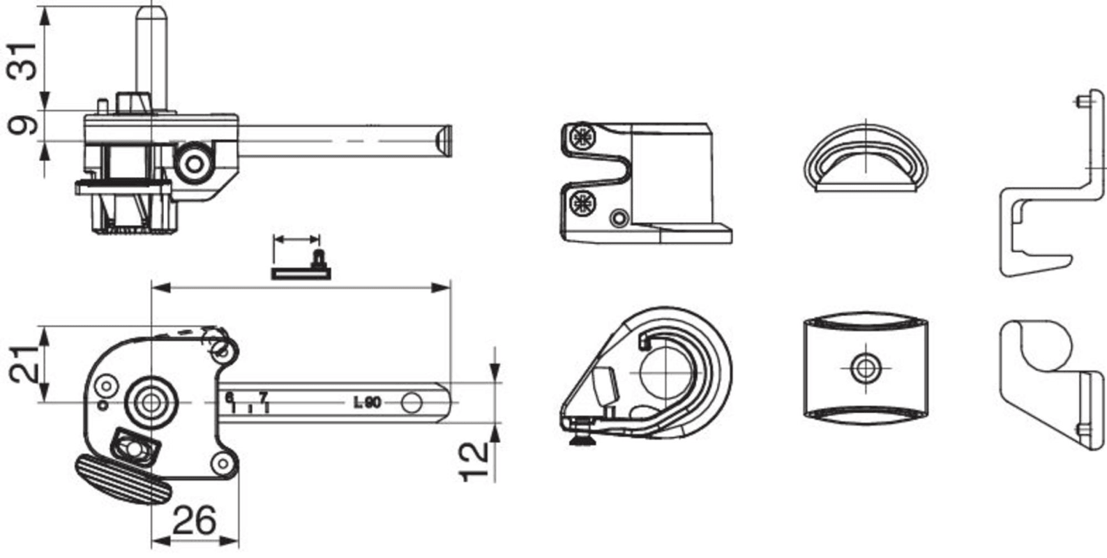 Rasthalter mit Kloben gerade mit Anschlagpuffer Abst. 110-140 L165 links schwarz-S