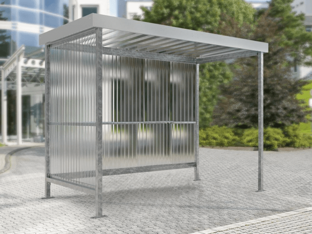 Raucherunterstand, Grundeinheit, Modell Jena • Schneller Wetterschutz • Platzsparend: nur 2,2 m² • Stahlkonstruktion • Rück- und Seitenwände: aus hochwertigem Wellpolycarbonat Lieferung: Grundeinhei