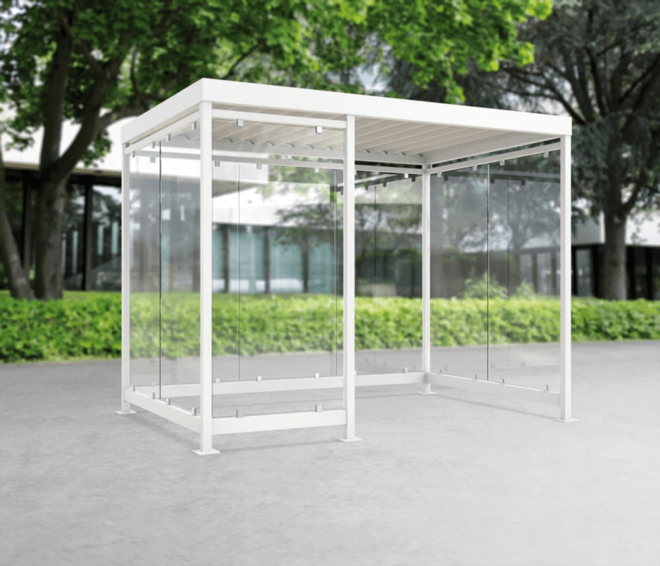 Raucherunterstand Köln, K3 c/b • Modularer, transparenter Raucherraum • Komplettlösung: fertig vormontiert, bequeme Aufstellung mit Kran • LGA-typengeprüft: ausgelegt auf hohe Schneelast: 1,90 kN/m²,