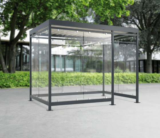 Raucherunterstand Köln, K3 d/b • Modularer, transparenter Raucherraum • Komplettlösung: fertig vormontiert, bequeme Aufstellung mit Kran • LGA-typengeprüft: ausgelegt auf hohe Schneelast: 1,90 kN/m²,