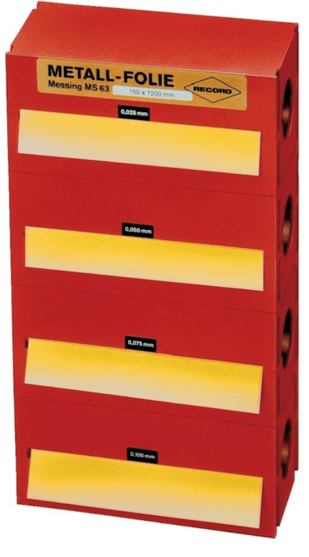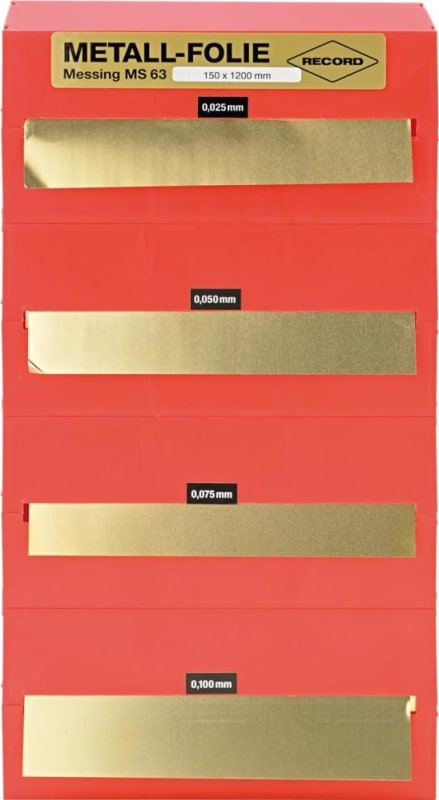 Metallfolien-Sortiment, Messing• 4 Einzelboxen mit je 1 Box Folienband (150 x 2500 mm) Toleranzen: 0,01–0,03 mm = 0,002 mm 0,04–0,05 mm = 0,003 mm 0,06–0,18 mm = 0,005 mm