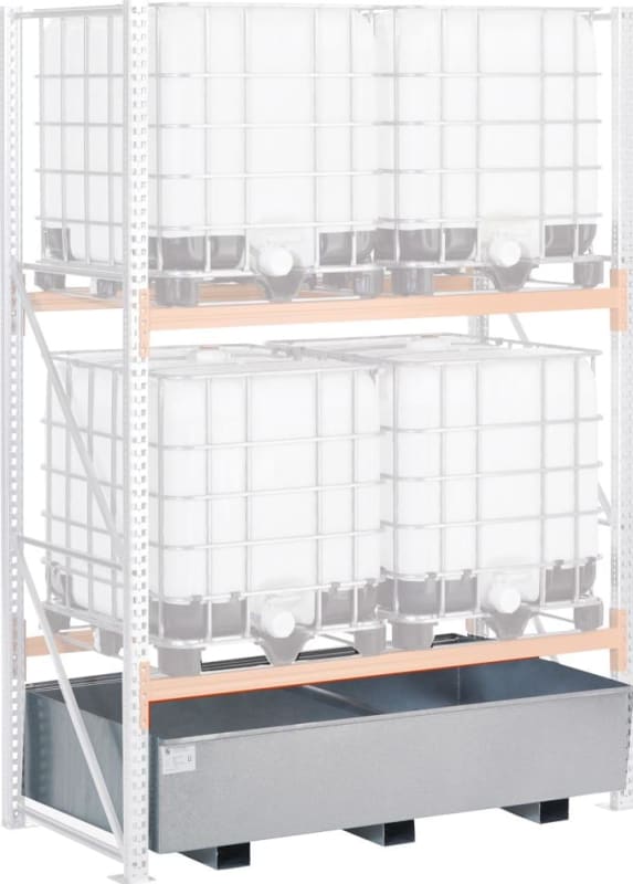 Bodenwanne für Gefahrstoff-Palettenregal, Großbehälter • Material: 3 mm Stahlblech • Korrosionsschutz durch Feuerverzinkung • Bodenfreiheit: 100 mm • Auffangwanne entsprechend WHG, Ü-Zeichen gegäß St