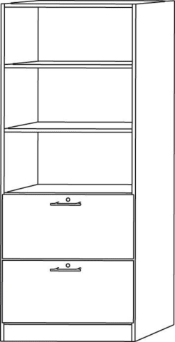 Kombiregal Serie Solid • Korpus: melaminharzbeschichtete Spanplatten, widerstandsfähig und pflegeleicht, Vorderkanten mit 2 mm stoßfesten ABS-Kanten • Türen: mit Griffknauf, Metallscharniere, Öffnung