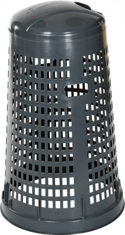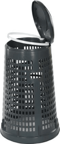 Korb-Abfallsammler, Kunststoff• Material: Kunststoff, dunkelgrau, aus einem Teil geformt • Mit Deckel • Ohne Bodenplatte Hinweis: Passend für 70-/120-Liter-Säcke.