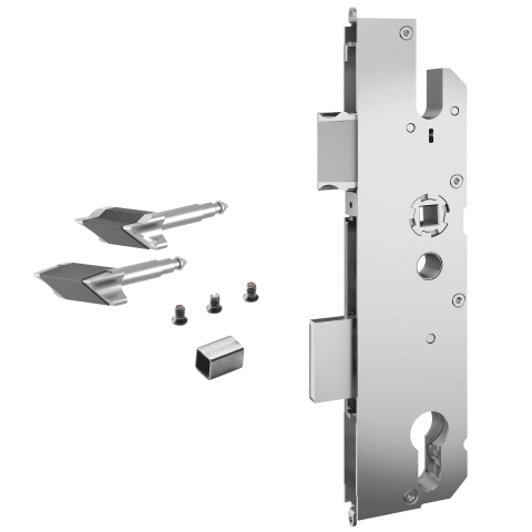 HAUPTSCHLOSS-SET BESTEHEND AUS: HAUPTSCHLOSS-TYP H, PZW, 30/92/10 MM, MIT ANGESCHRAEGTER SOFTLOCKFALLE, LOSER 2 MM ABGESETZTER SOFTLOCKFALLE, REDUZIERHUELSE 10 AUF 8 MM VIERKANT, 3 BEFESTIGUNGSSCHRAUB