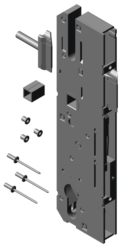 HAUPTSCHLOSS-SET BESTEHEND AUS: HAUPTSCHLOSS-TYP H, PZW, 35/92/10 MM, MIT ANGESCHRAEGTER SOFTLOCKFALLE, LOSER 2 MM ABGESETZTER SOFTLOCKFALLE, REDUZIERHUELSE 10 AUF 8 MM VIERKANT, 3 BEFESTIGUNGSSCHRAUB