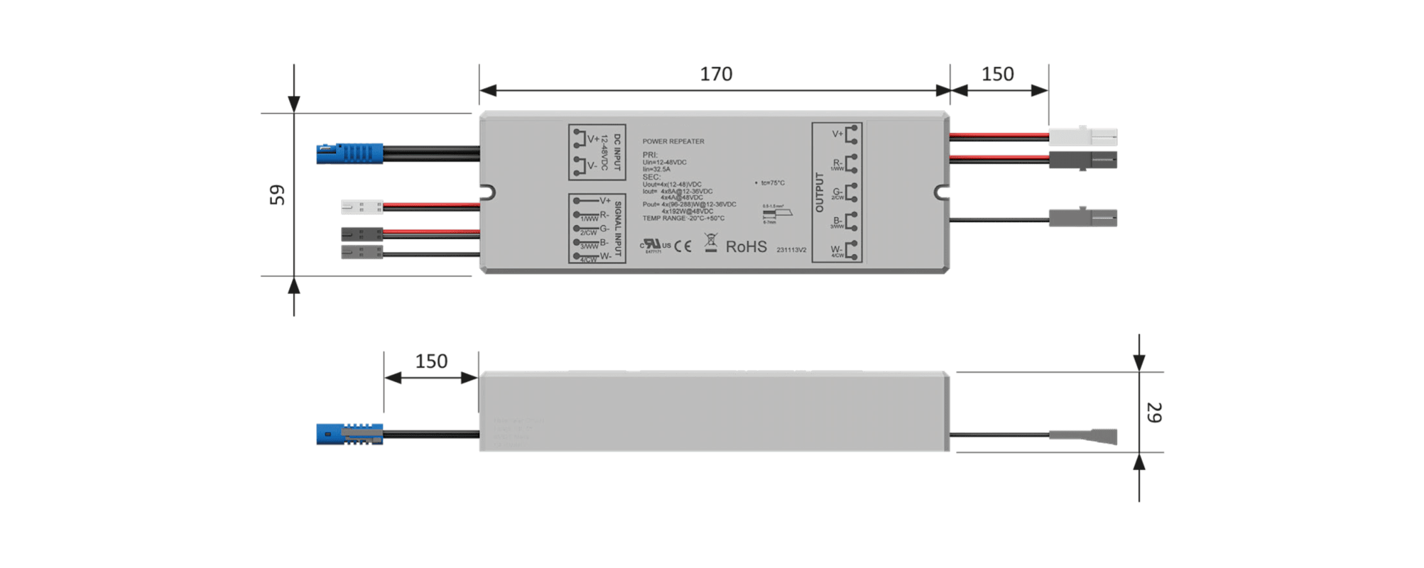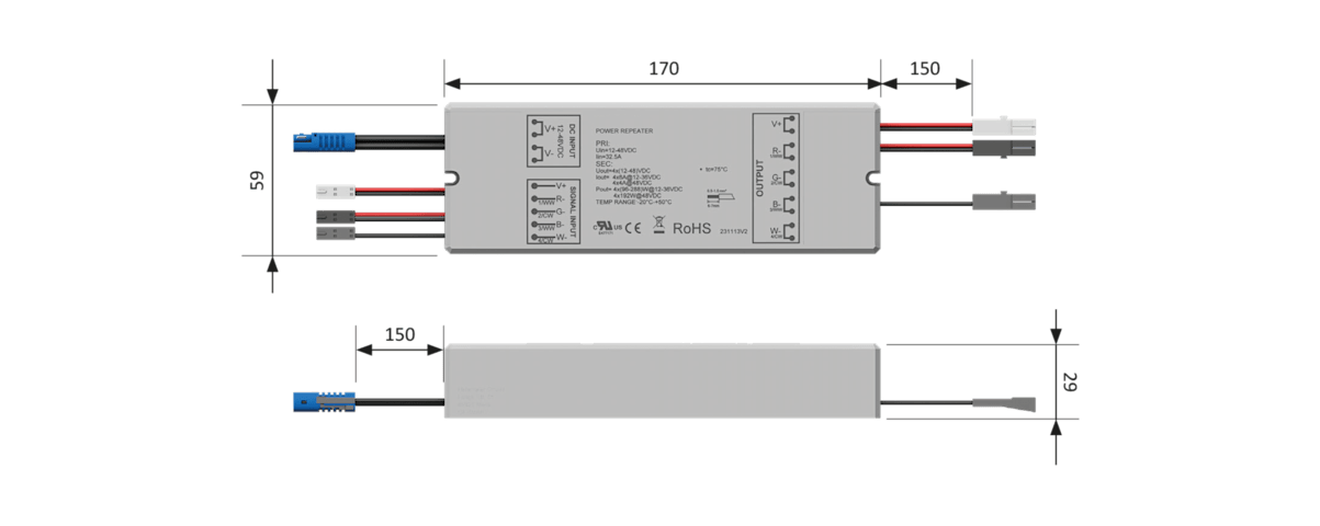 Halemeier Repeater; Ausführung: für IR-Sendeimpulse; Funktion: Reichweitenverlängerung; Einsatzbereich: LED Dimmer; Leistungsaufnahme: 150 W; Nennspannung: 24 V; Basis: Repeater
