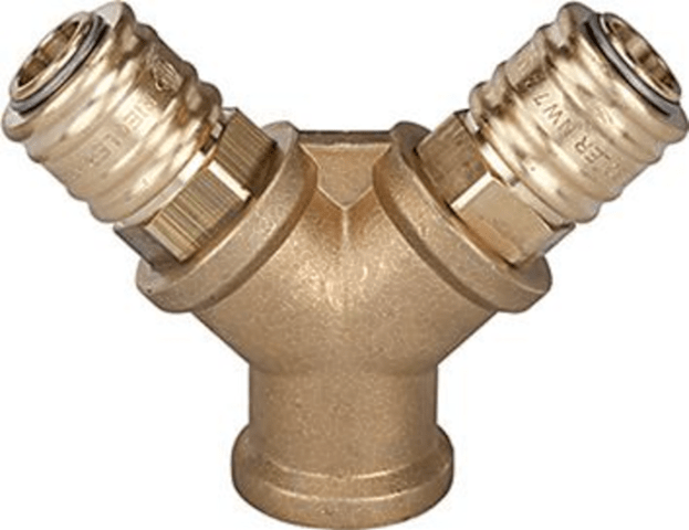DruckluftverteilerAus Messing, mit Außen-(AG) und Innengewinde (IG) sowie 2 Abgängen mit Schnellverschlusskupplungen.