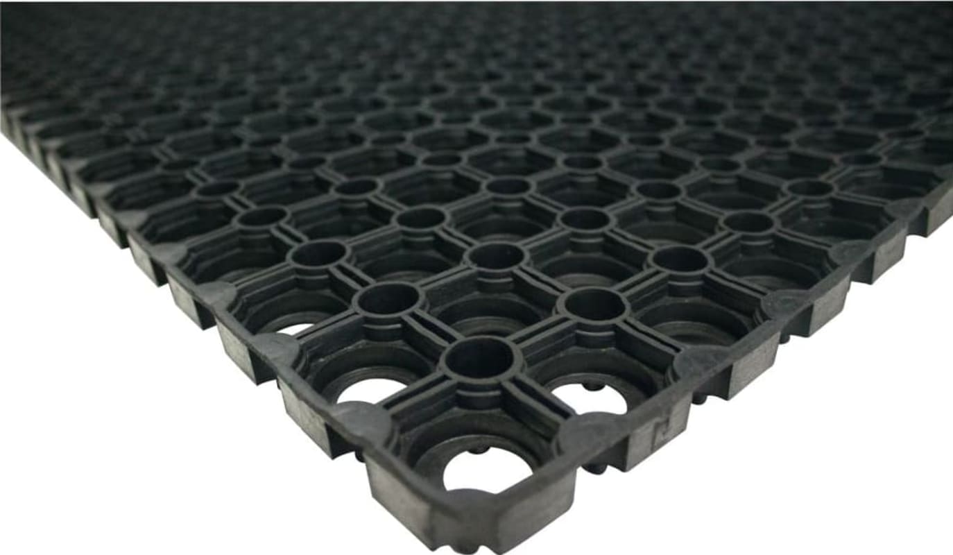 Ringmatte • Zur Aufnahme von grobem Schmutz in anspruchsvoller Umgebung • Rutschsicherheit: angehobene Oberfläche für gesteigerte Rutschsicherheit • Rutschhemmung: R10 nach EN 13552 • Schmutz wird von der durchbrochenen Oberfläche aufgenommen • Material: Gummi