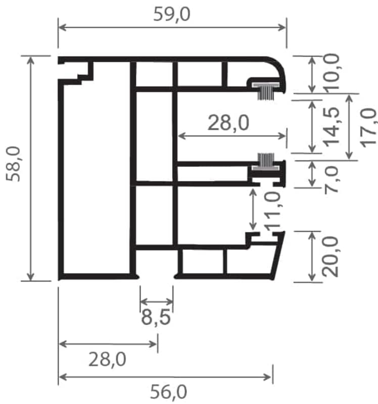 Rollladenführung 59x58 mm Lg. 6,50 m foliert, für Insektenschutz, GK Grau mit zwei schwarzen Bürsten 436 1007 METBRUSH MESSING [191]