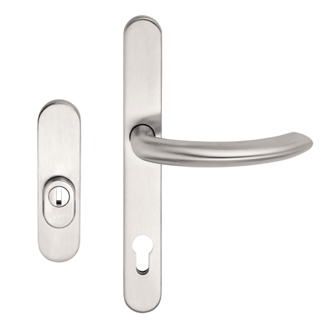BKS Schutz-Drückergarnitur LEGATO B-73070; Abdeckung: Langschild; Widerstandsklasse: ES 1 (SK2); Form: oval; Vierkant: 8 mm; Material: Edelstahl; Lagerung: wartungsfrei,festdrehbar; Befestigungstechni