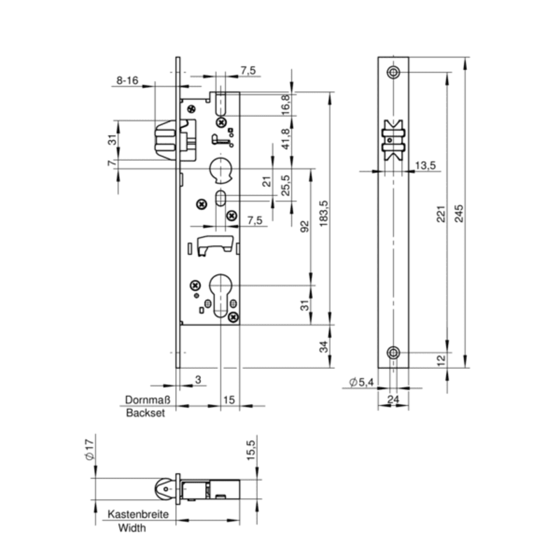 Kastenbreite Dornmaß + 15 mm